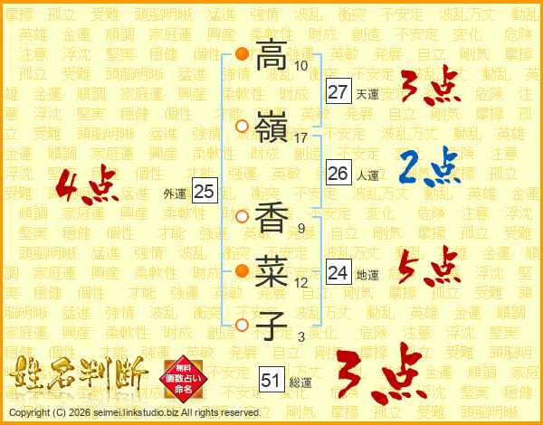 高(10画)嶺(17画) 香(9画)菜(12画)子(3画)