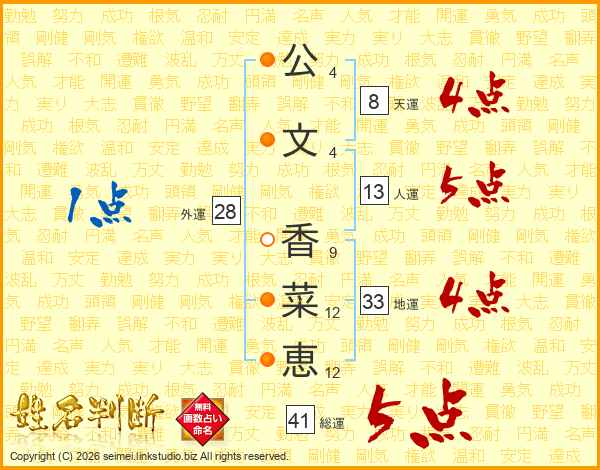 公(4画)文(4画) 香(9画)菜(12画)恵(12画)
