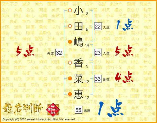 小(3画)田(5画)嶋(14画) 香(9画)菜(12画)恵(12画)