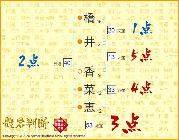 橋(16画)井(4画) 香(9画)菜(12画)恵(12画)