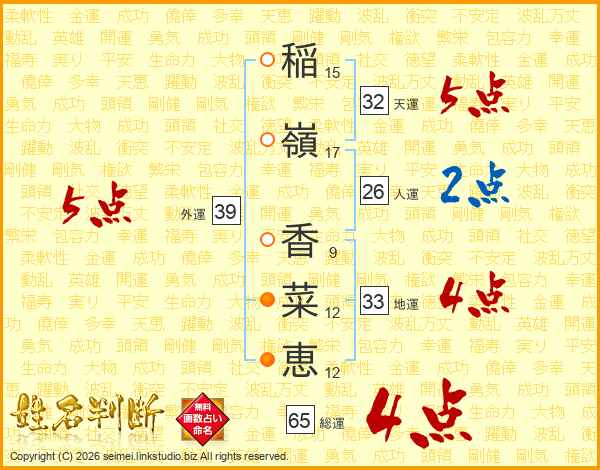 稲嶺香菜恵さんの総運は65画の4点!
