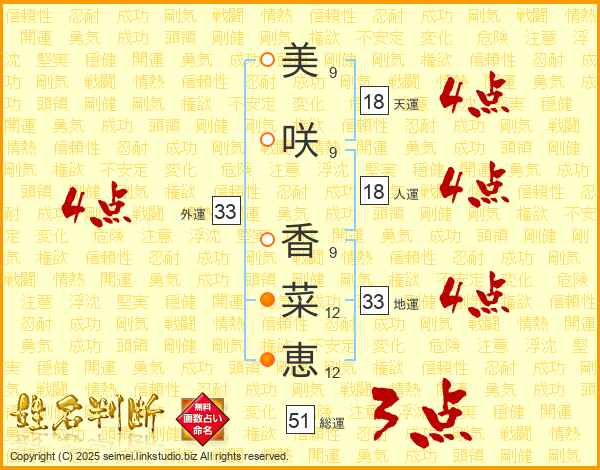 美(9画)咲(9画) 香(9画)菜(12画)恵(12画)