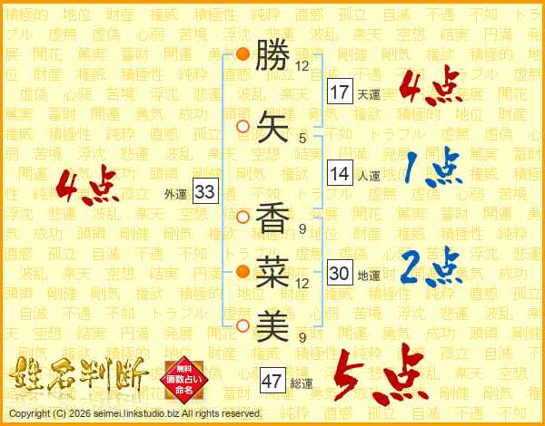 勝(12画)矢(5画) 香(9画)菜(12画)美(9画)