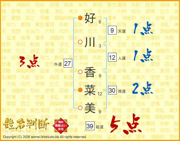 生活面を象徴する運勢です。外部から受ける影響力を表し、結婚運、家庭運や職場、環境への順応性を表します。総運から人運を引いた画数。姓や名が1文字の場合を除く。