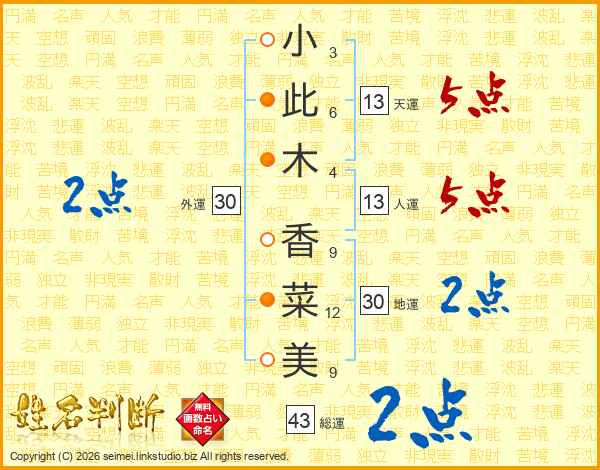 生活面を象徴する運勢です。外部から受ける影響力を表し、結婚運、家庭運や職場、環境への順応性を表します。総運から人運を引いた画数。姓や名が1文字の場合を除く。