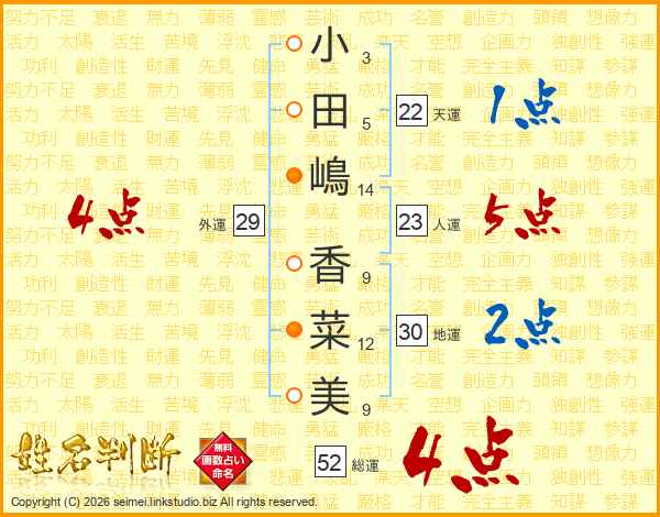 小(3画)田(5画)嶋(14画) 香(9画)菜(12画)美(9画)