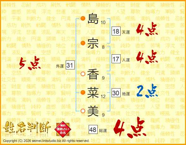 島(10画)宗(8画) 香(9画)菜(12画)美(9画)