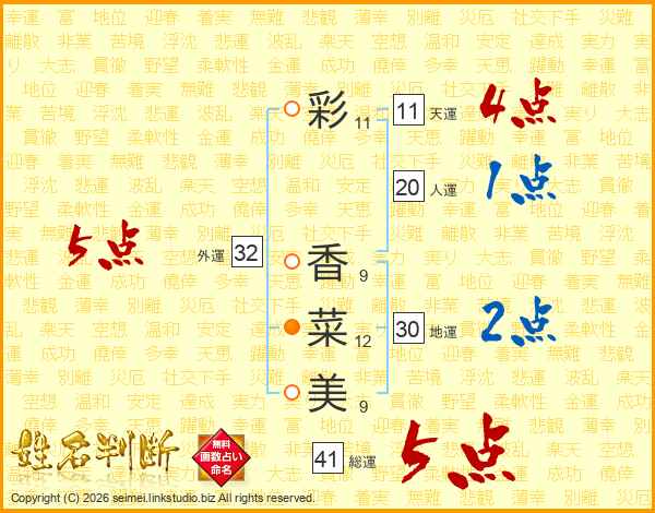 彩香菜美さんの総運は41画の5点!