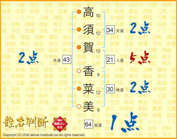 高(10画)須(12画)賀(12画) 香(9画)菜(12画)美(9画)