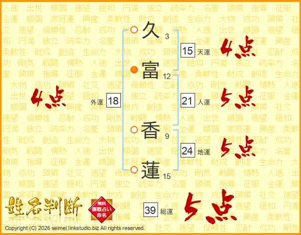 久富香蓮さんの総運は39画の5点!