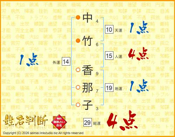中(4画)竹(6画) 香(9画)那(7画)子(3画)