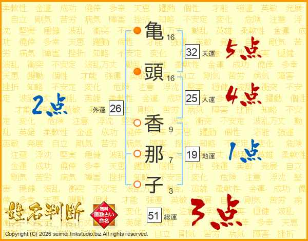 亀(16画)頭(16画) 香(9画)那(7画)子(3画)