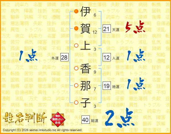 伊(6画)賀(12画)上(3画) 香(9画)那(7画)子(3画)