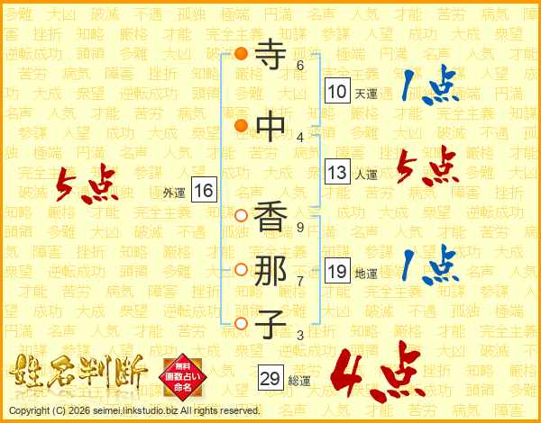 寺(6画)中(4画) 香(9画)那(7画)子(3画)