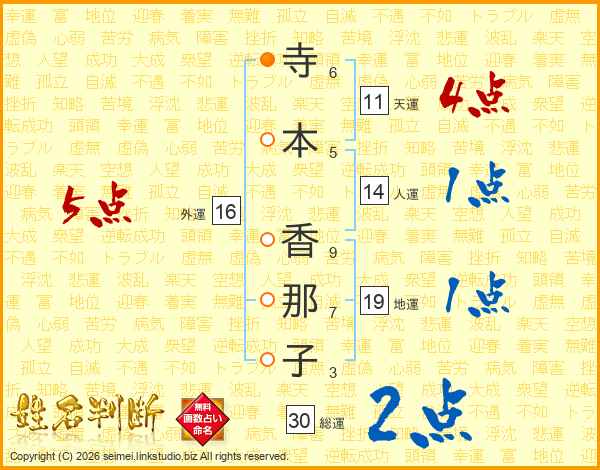 寺(6画)本(5画) 香(9画)那(7画)子(3画)