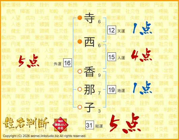 寺(6画)西(6画) 香(9画)那(7画)子(3画)