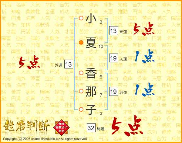 小(3画)夏(10画) 香(9画)那(7画)子(3画)