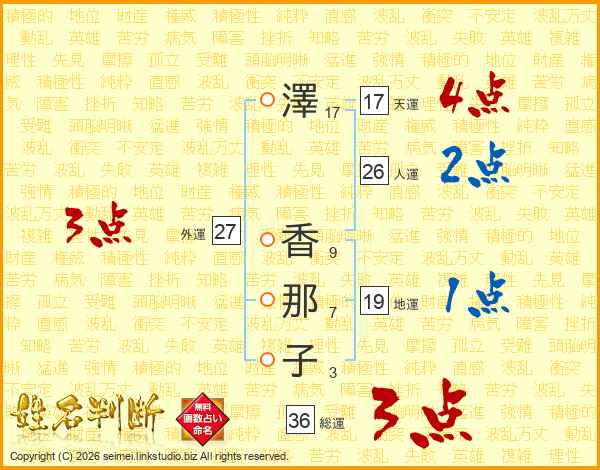 生活面を象徴する運勢です。外部から受ける影響力を表し、結婚運、家庭運や職場、環境への順応性を表します。総運から人運を引いた画数。姓や名が1文字の場合を除く。