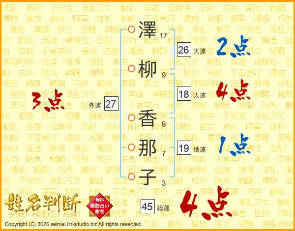 澤(17画)柳(9画) 香(9画)那(7画)子(3画)