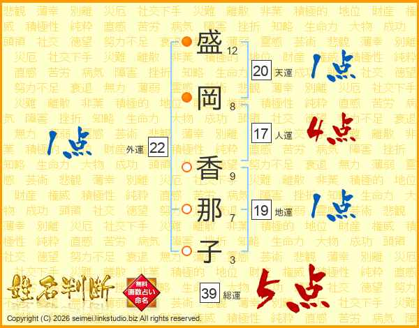盛岡香那子さんの総運は39画の5点!