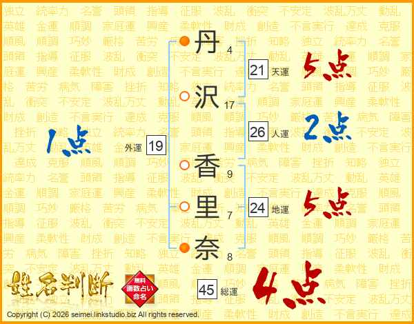 丹(4画)沢(17画) 香(9画)里(7画)奈(8画)