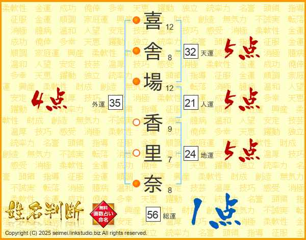 喜(12画)舎(8画)場(12画) 香(9画)里(7画)奈(8画)