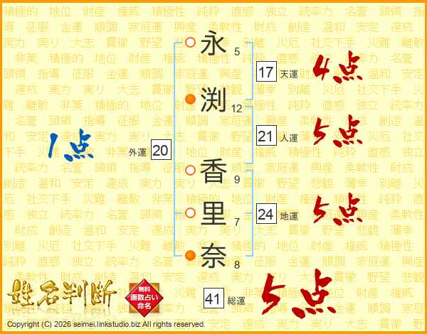 永(5画)渕(12画) 香(9画)里(7画)奈(8画)