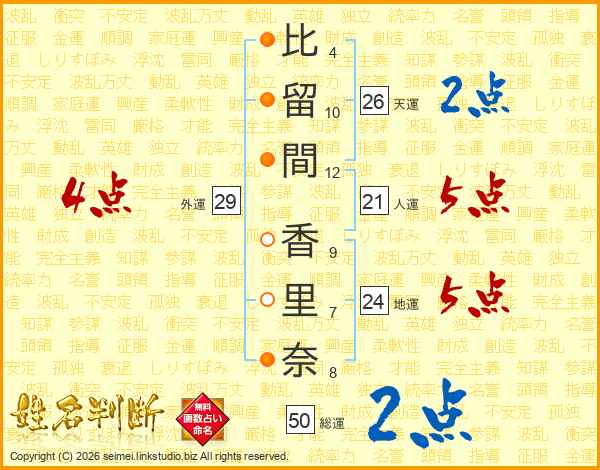 比(4画)留(10画)間(12画) 香(9画)里(7画)奈(8画)