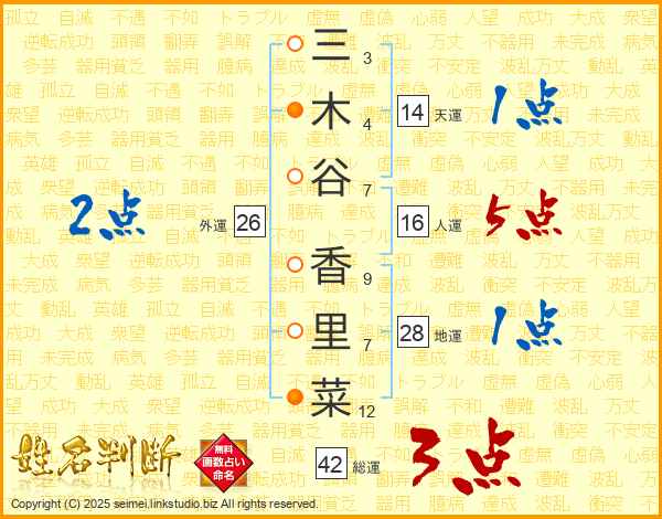 三(3画)木(4画)谷(7画) 香(9画)里(7画)菜(12画)