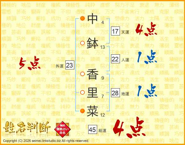 中(4画)鉢(13画) 香(9画)里(7画)菜(12画)