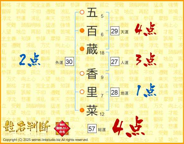 五(5画)百(6画)蔵(18画) 香(9画)里(7画)菜(12画)