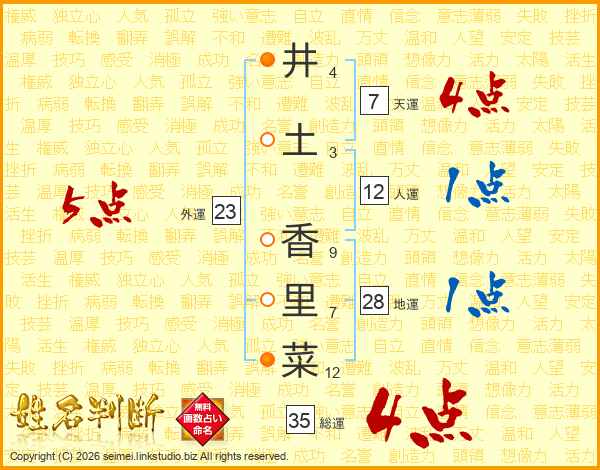 井(4画)土(3画) 香(9画)里(7画)菜(12画)
