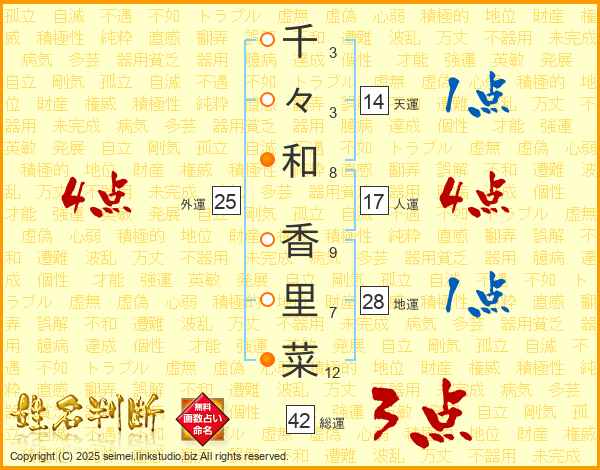 千(3画)々(3画)和(8画) 香(9画)里(7画)菜(12画)