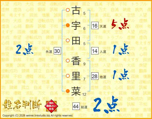 古(5画)宇(6画)田(5画) 香(9画)里(7画)菜(12画)