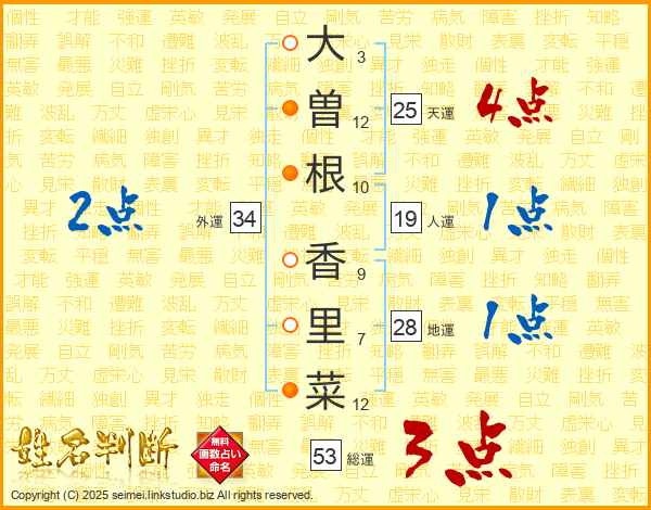 大(3画)曽(12画)根(10画) 香(9画)里(7画)菜(12画)