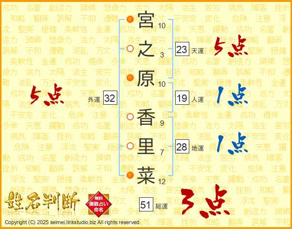 宮(10画)之(3画)原(10画) 香(9画)里(7画)菜(12画)