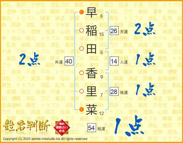 早(6画)稲(15画)田(5画) 香(9画)里(7画)菜(12画)