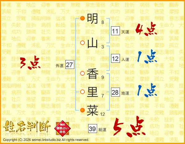 明(8画)山(3画) 香(9画)里(7画)菜(12画)