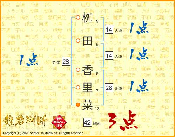 栁(9画)田(5画) 香(9画)里(7画)菜(12画)