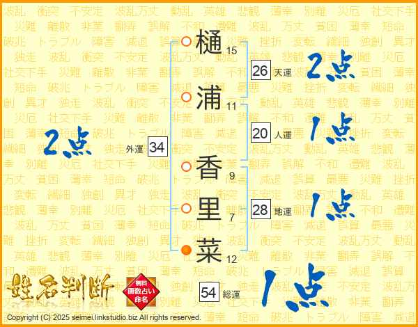 樋(15画)浦(11画) 香(9画)里(7画)菜(12画)