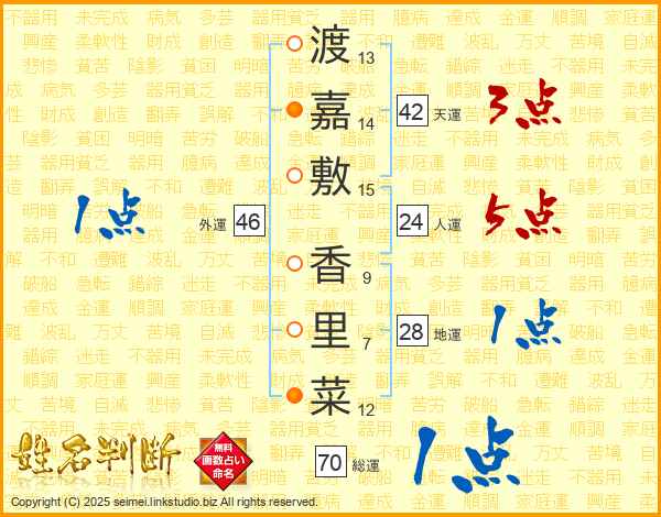 渡(13画)嘉(14画)敷(15画) 香(9画)里(7画)菜(12画)
