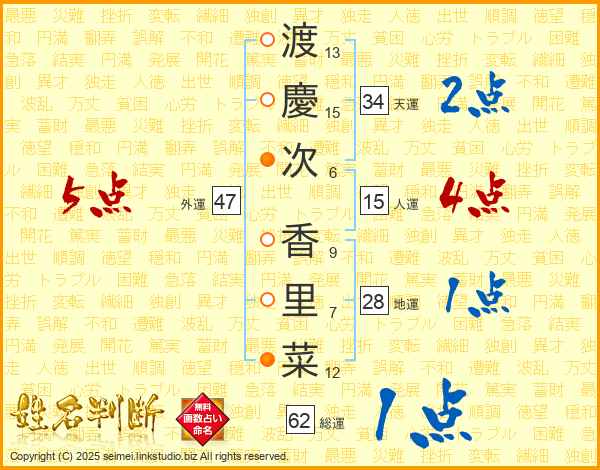 渡(13画)慶(15画)次(6画) 香(9画)里(7画)菜(12画)