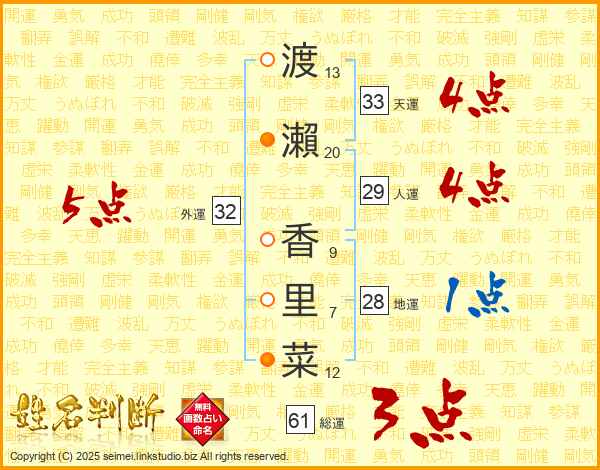 渡(13画)瀨(20画) 香(9画)里(7画)菜(12画)
