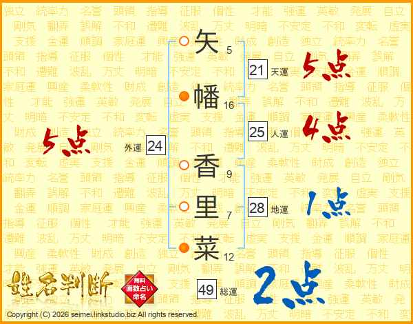 矢幡香里菜さんの総運は49画の2点!