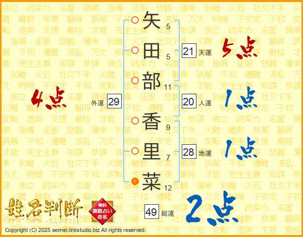 矢田部香里菜さんの総運は49画の2点!