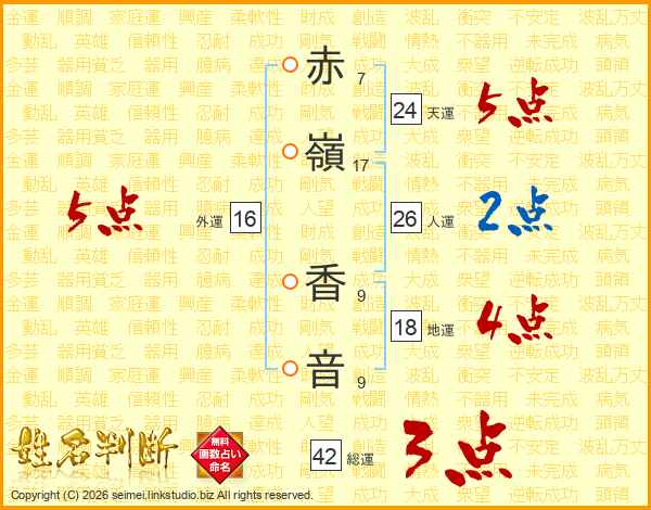 赤(7画)嶺(17画) 香(9画)音(9画)