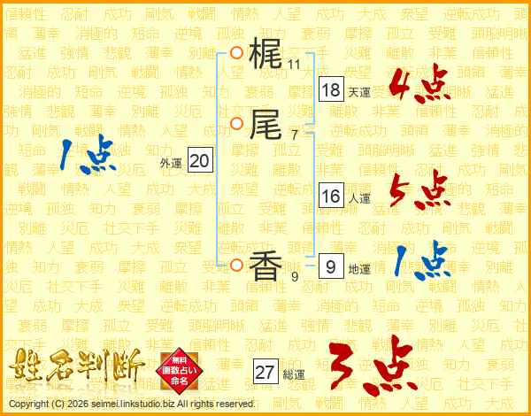 梶(11画)尾(7画) 香(9画)