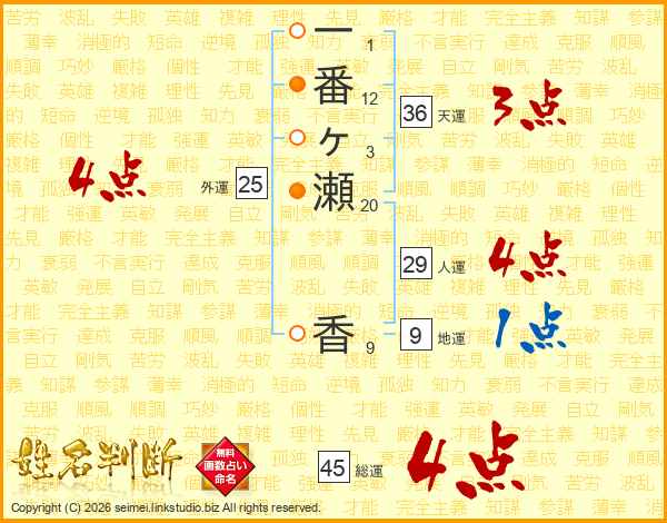 一番ヶ瀬香さんの総運は45画の4点!