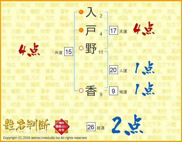 入(2画)戸(4画)野(11画) 香(9画)