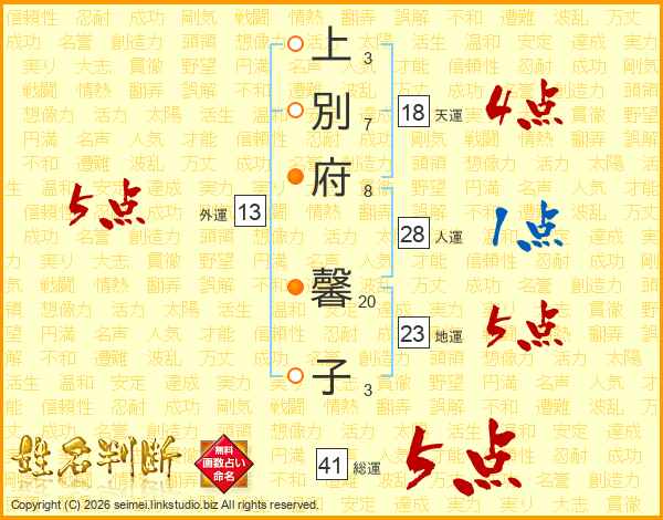 上(3画)別(7画)府(8画) 馨(20画)子(3画)